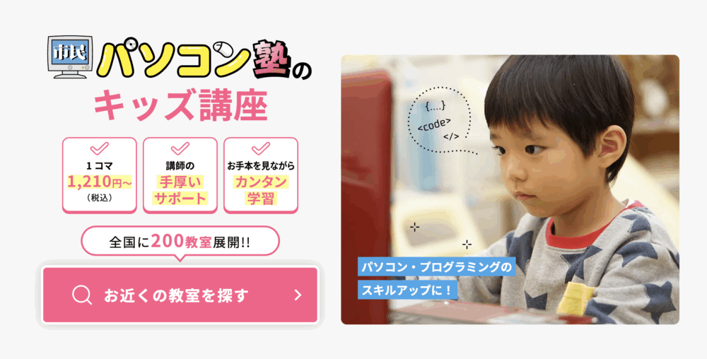 全国に展開する市民パソコン塾は、個別指導を中心に基礎から丁寧に教えてくれる教室です。パソコンの操作に不安があるお子さまでも、マウスの使い方やタイピングからスタートできる安心のカリキュラム。Scratchなどのビジュアルプログラミングを通じて、楽しみながら論理的な思考力を育てていけます。